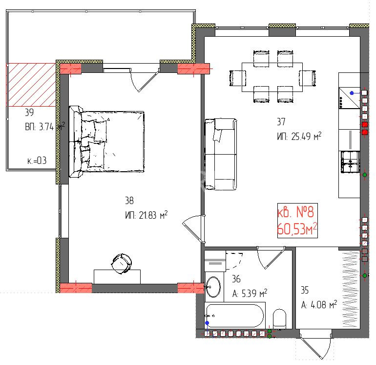 Зовні будинок побудований з цегли та утеплений 10 см пінопластом, вікна – енергозберігаючі (три скла), дах-плоский покритий мембраною.