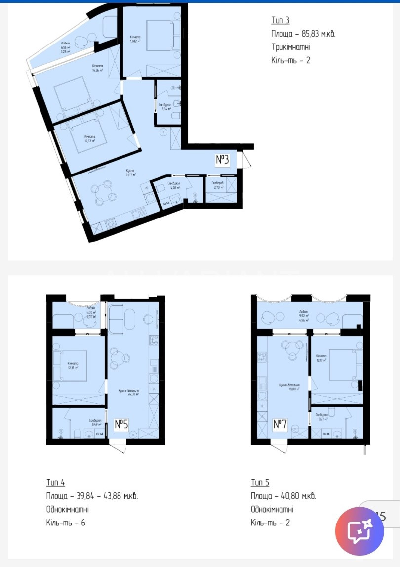 – трьох кімнатні;