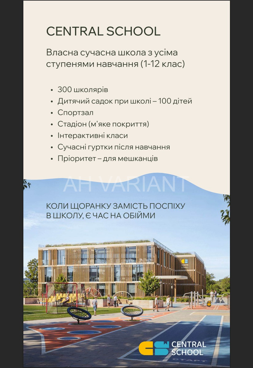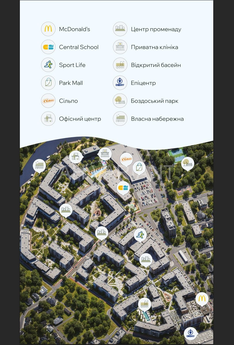 ЖК Central Park – це місто в місті. На території буде: 16 будинків (4-7 поверхів), басейни, власна набережна, 13 гектар закритої території, парки, магазини, кав’ярні, ресторани, підземні паркінги, дитячі майданчики, фітнес-центр, власна школа та багато іншого.