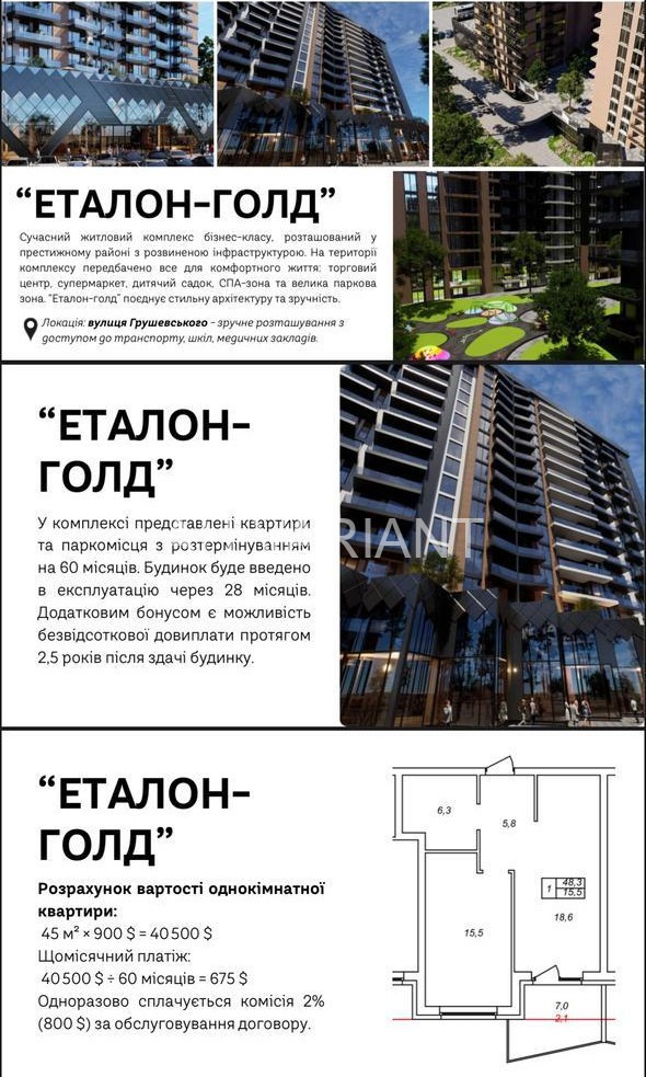 – 1000 $/м.кв повне розтермінування ( на 48 місяців).