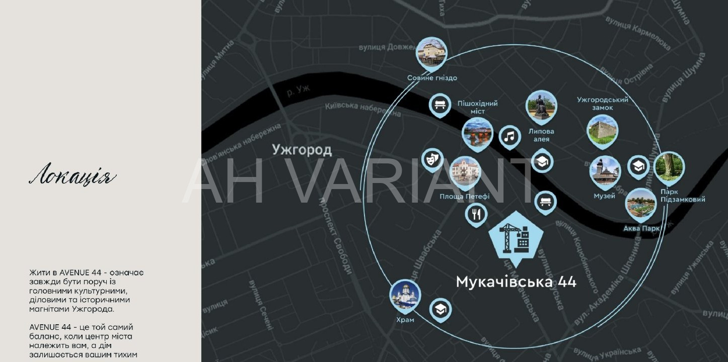 Жити в 44 AVENUE – означає бути в центрі подій. ЖК розташований у самому серці міста, поруч із історичними пам’ятками, мальовничою набережною та престижними закладами освіти. У пішій доступності – школи, садочки, лікерні, фітнес-зал, магазини та кафе. Також на території ЖК є сучасне бомбосховище та підземний паркінг. Ви отримуєте не житло, а унікальну атмосферу міського життя з доступом до всього необхідного.