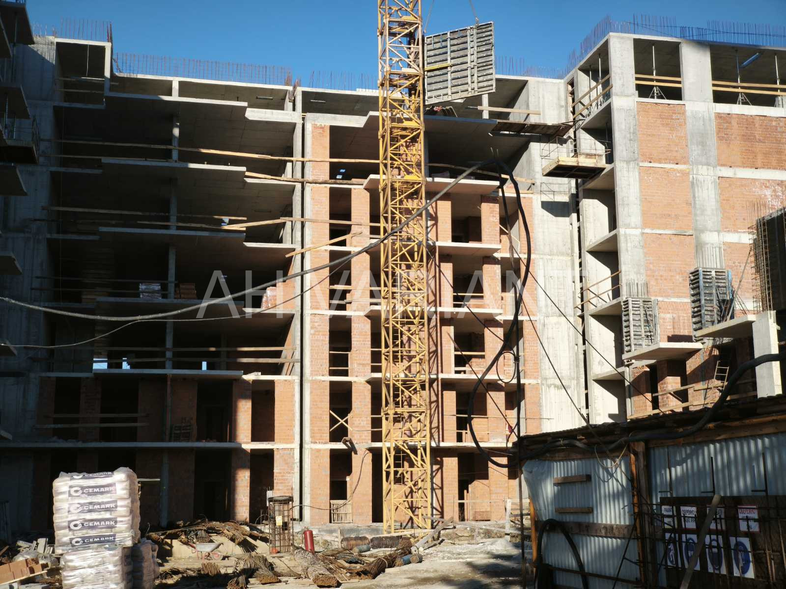 Зовні будинок 7-поверховий, побудований по монолітно-каркасній технології з використанням червоної цегли, фасад вентильований із травертину, утепленний мінватою, панорамні енергозберігаючі вікна.