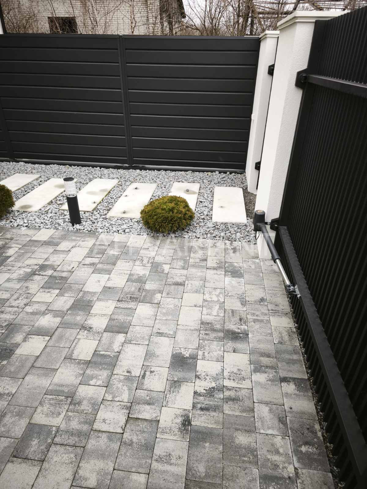 Подвір’ї закрито парканом від сусідів, фасадний паркан з каліткою та воротами на автоматиці, викладений бруківкою , озеленений.