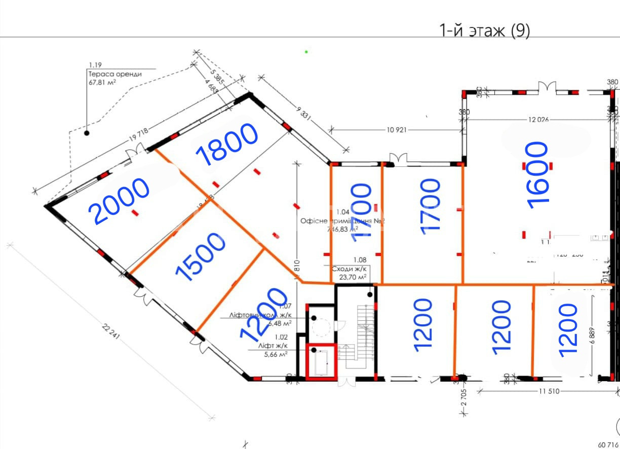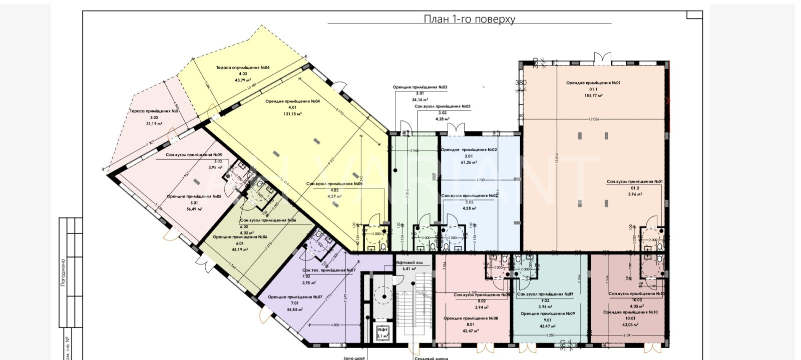 До вашої уваги пропонуємо приміщення з площею: 62.55 , 52.21, 60.44, 135.42, 38.88, 65.54, 189.73, 47.88, 47.43, 47.41 м.кв.