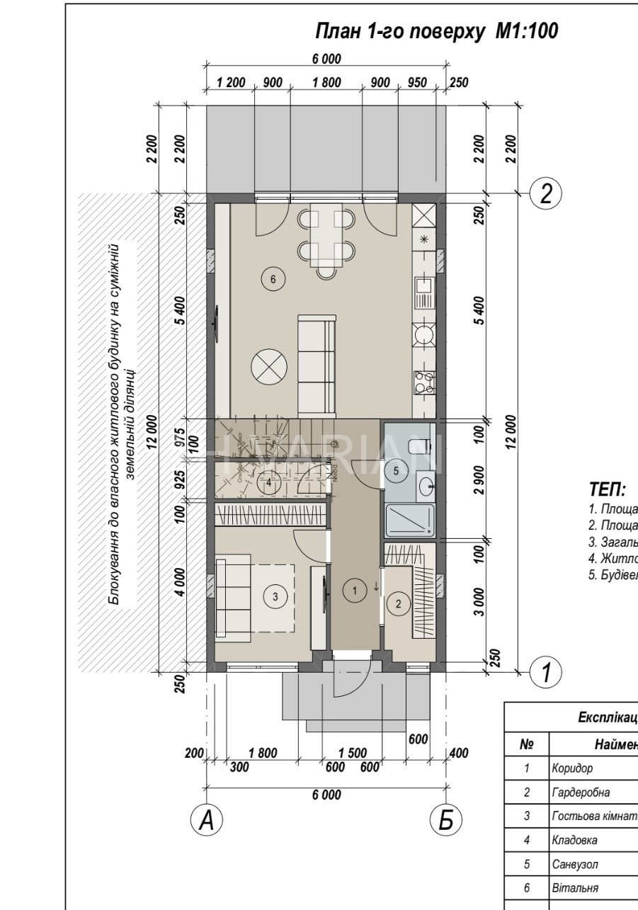 – перший поверх: хол, санвузол, комора, кухня-студія з виходом на терасу, спальня, гардероб.