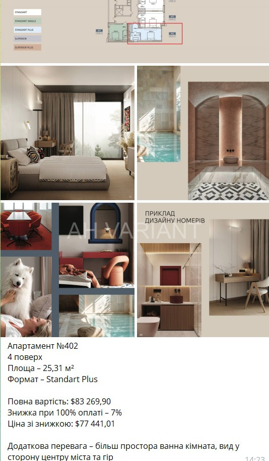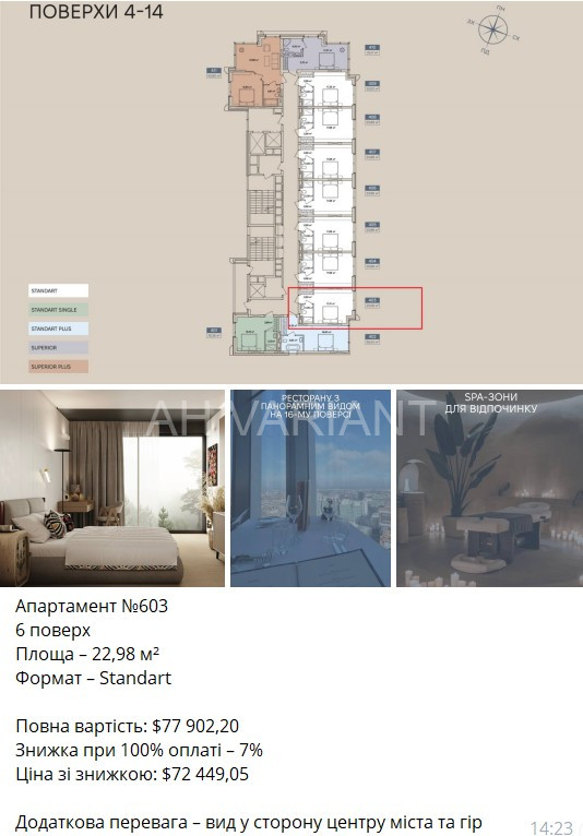 При 100% оплаті – знижка -7% – від 2966 $/м.кв – до 3738 $/м. кв (загальна вартість від 62 371 $ – 132 530 $)