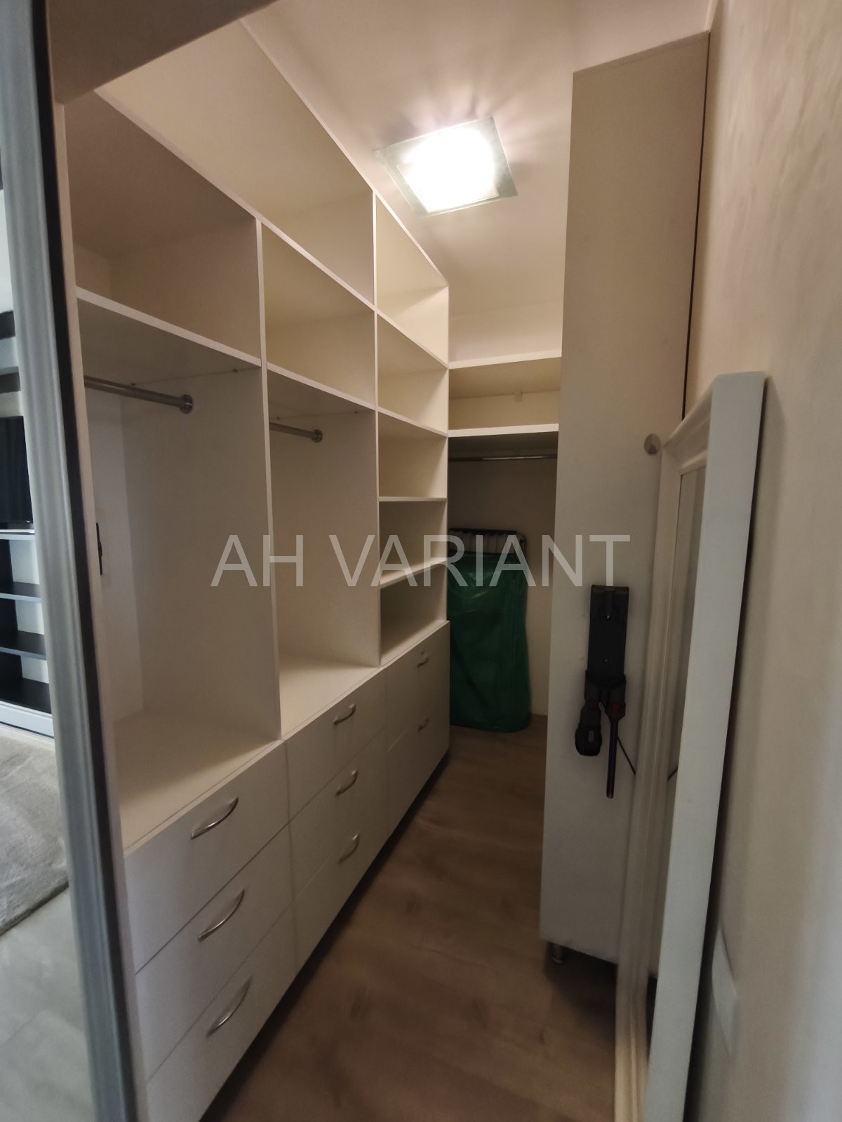 План: кухня- студіо з виходом на балкон, дитяча, суміжний санвузол, спальня з виходом на балкон, гардеробна.