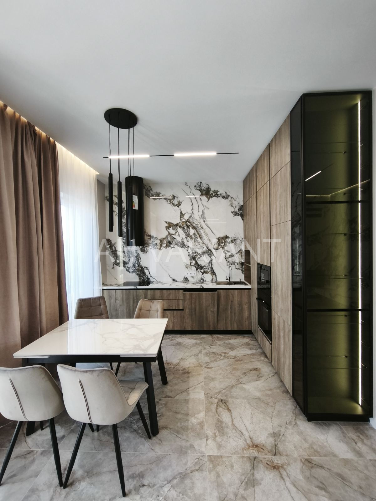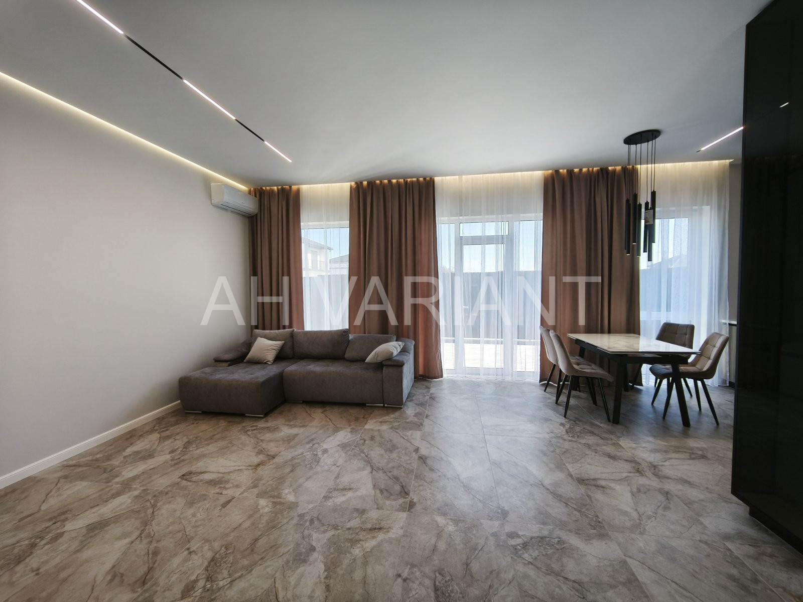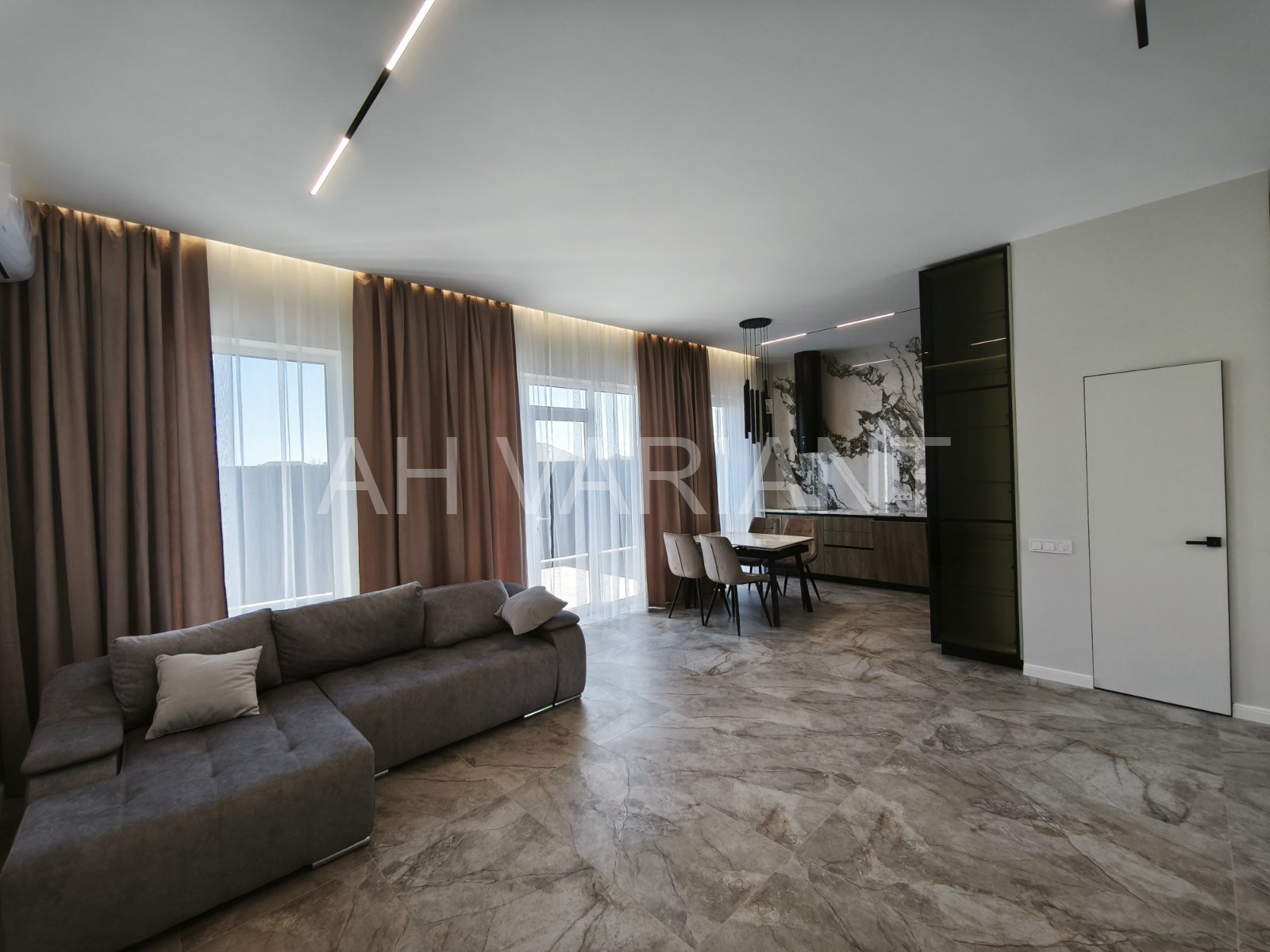 Всередині котеджу зроблено стильний євроремонт, встановлено під замовлення (вмонтовану кухню, стіл з стільцями, м’які меблі із ліжками, облаштовані санвузли та побутова техніка). Повна комплектація.