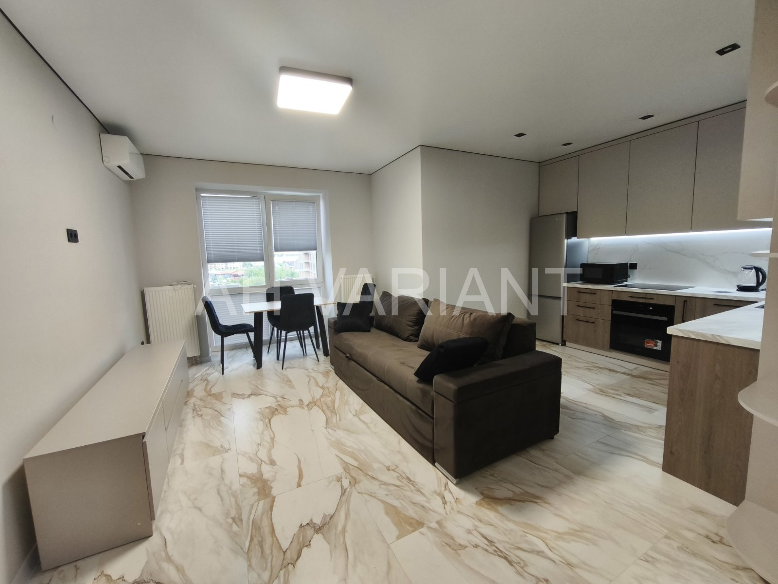 Зручне планування: простора кухня студіо, суміжний балкон, кімната з виходом на балкон.