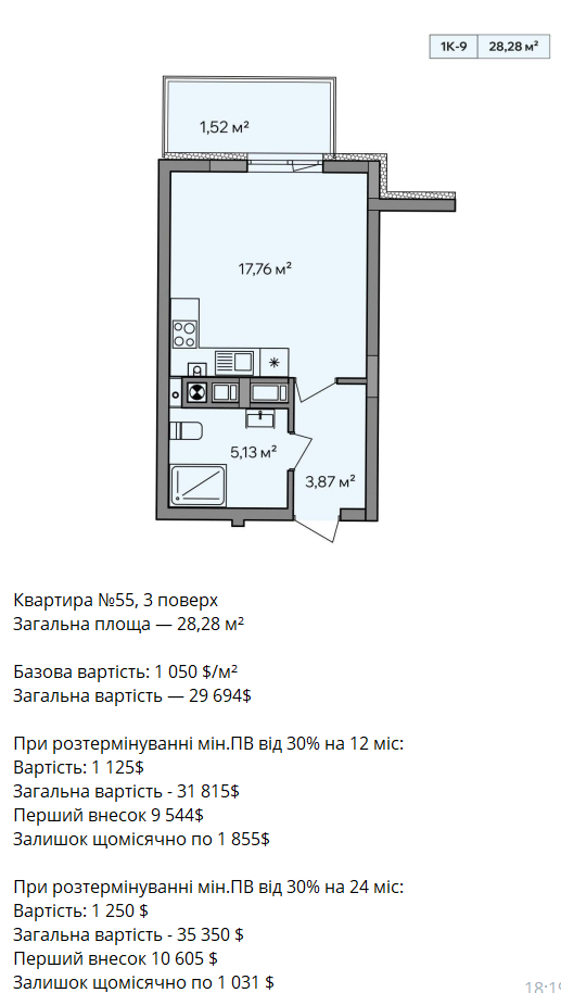 – Паркінг 1050 $/м.кв. (площа +- 14 м.кв.)