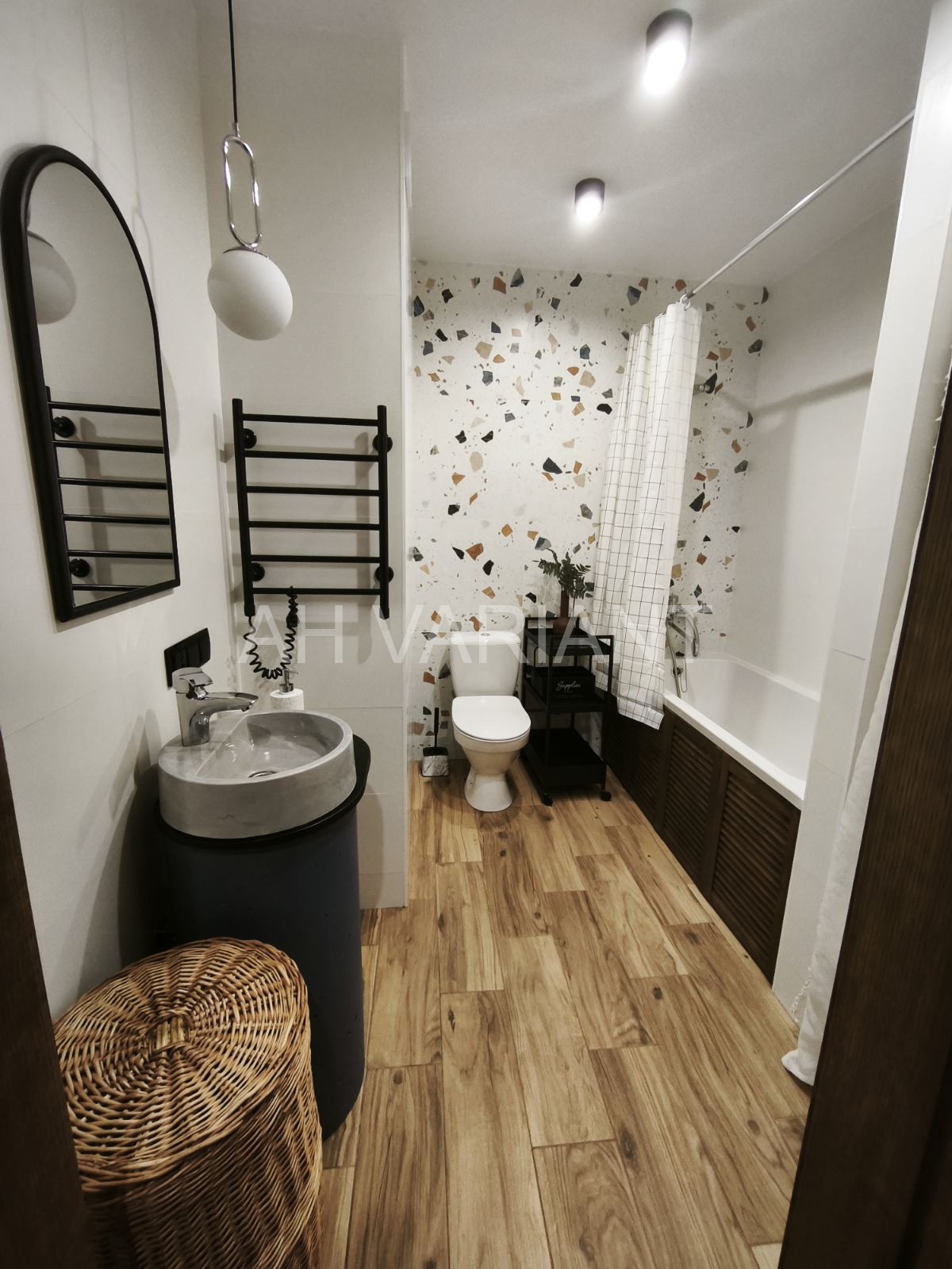 Всередині квартири власники зробили стильний євроремонт в англійському стилі, всі меблі, м’яка частина та техніка була придбана під замовлення. Міжкімнатні двері , стіл з стільцями зроблені з натурального дерева. Залишається все як на фото.