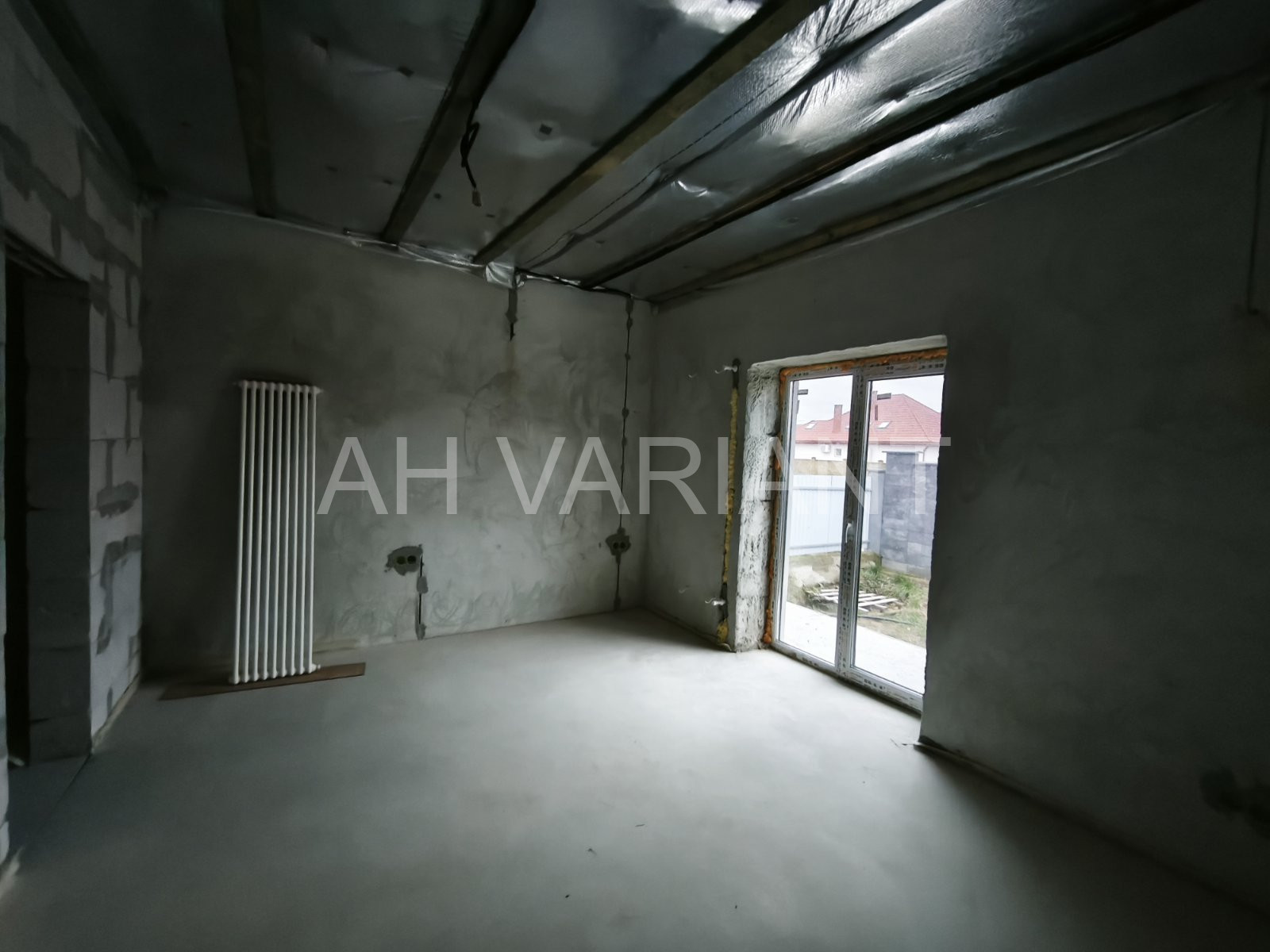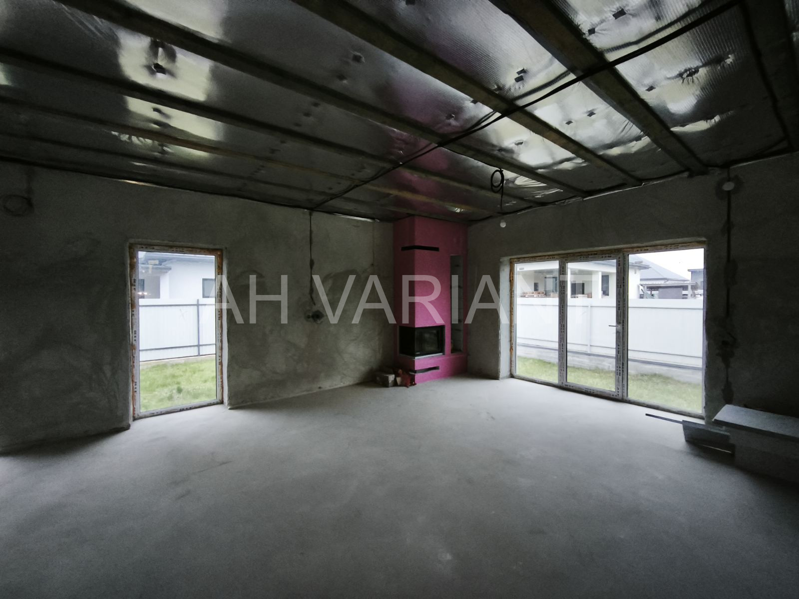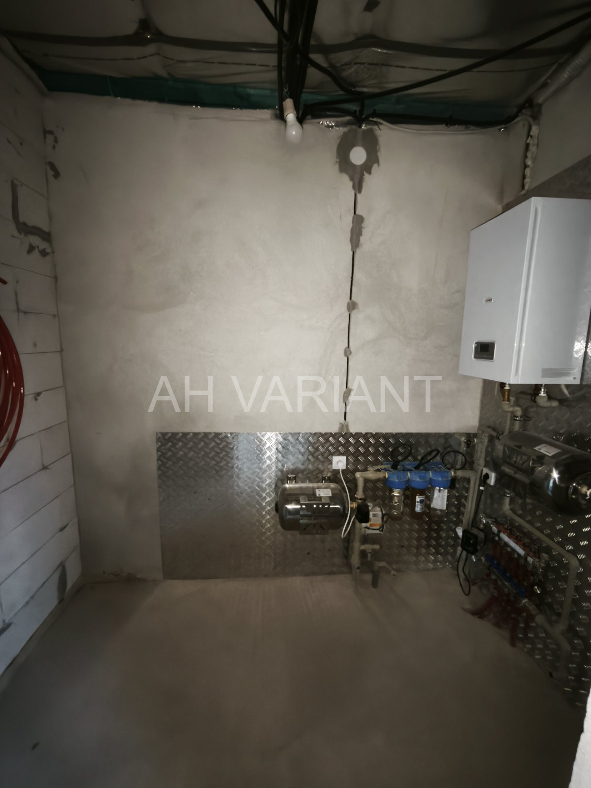 Всередині власники виконали таку роботу : розвели електрику та сантехніку, встановлено в санвузлах інсталяції з унітазами, встановлено електрокотел та електробойлер, гребінка з теплою підлогою по всьому будинку крім кімнат, в кімнатах батареї, встановлено твердопаливний камін ( 12 кіловат), чистова стяжка.