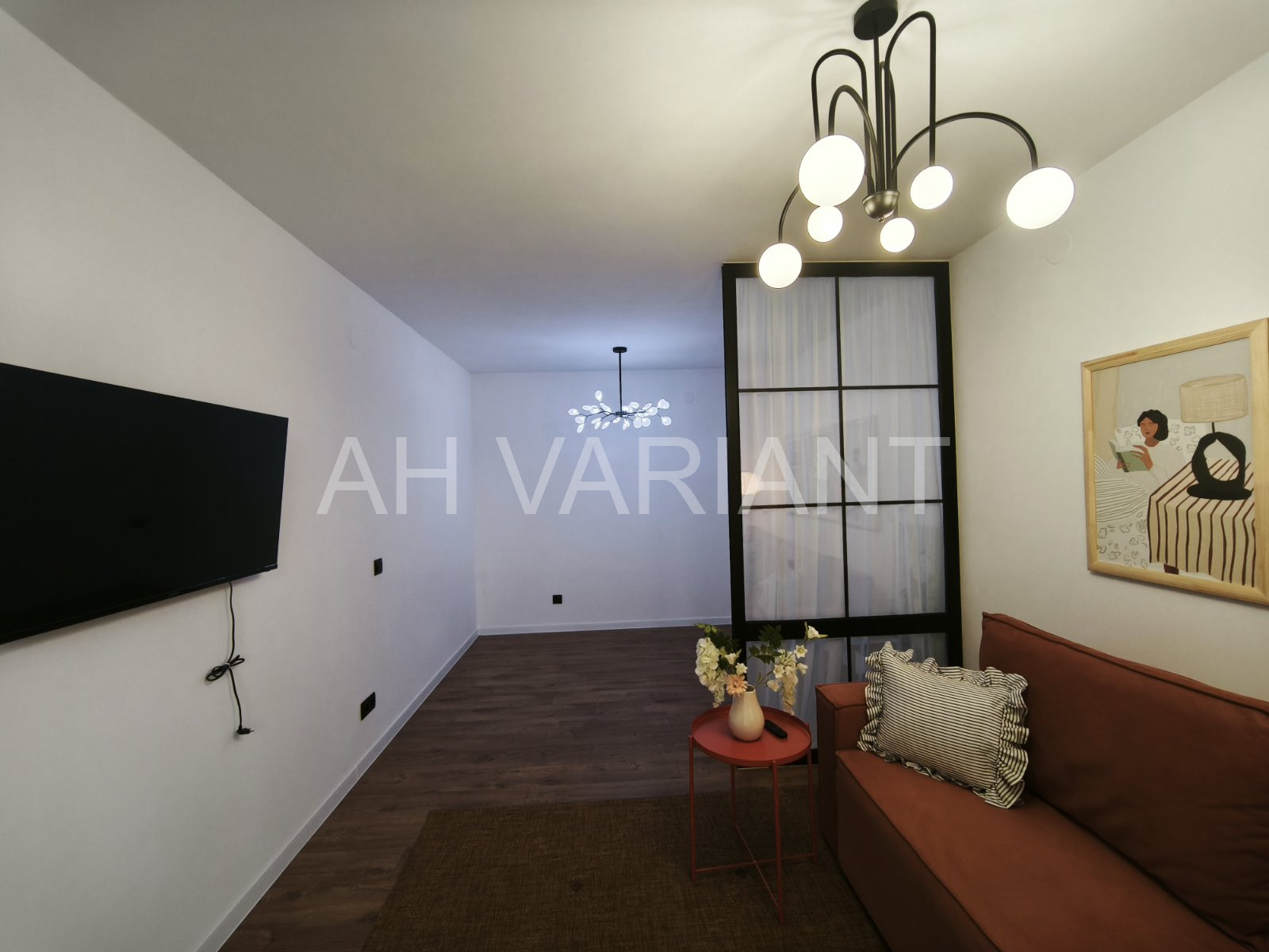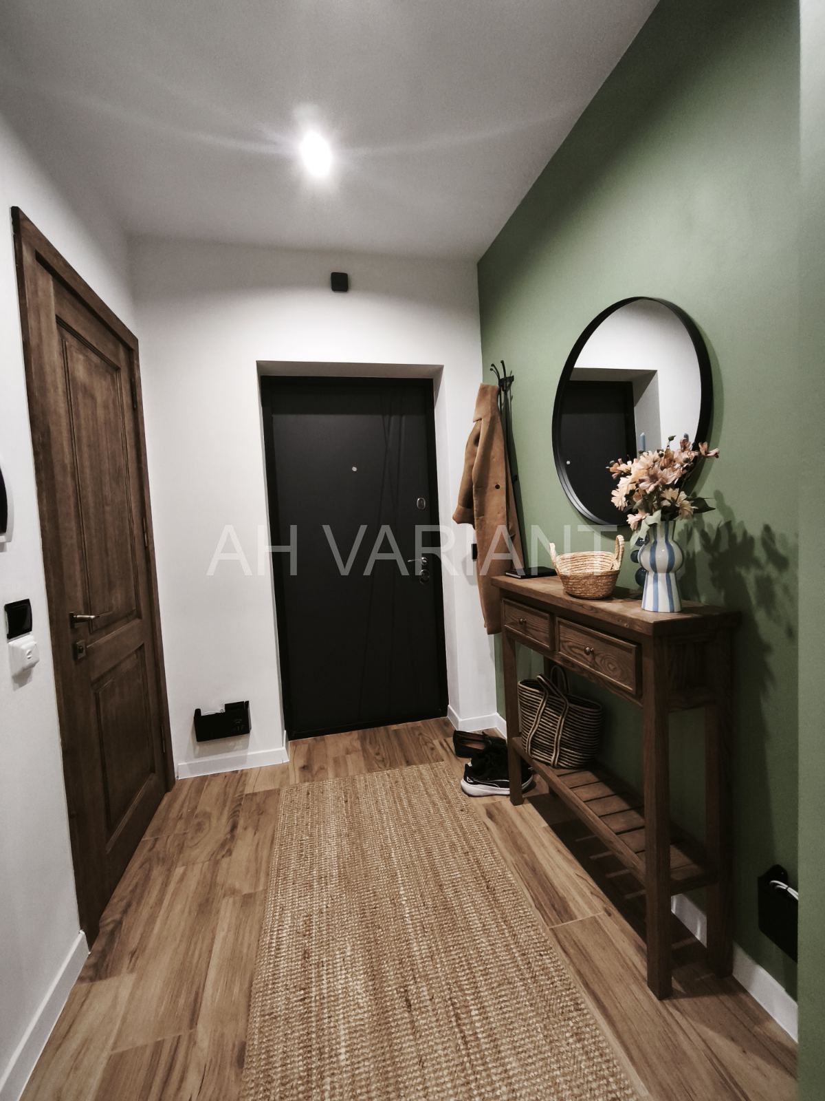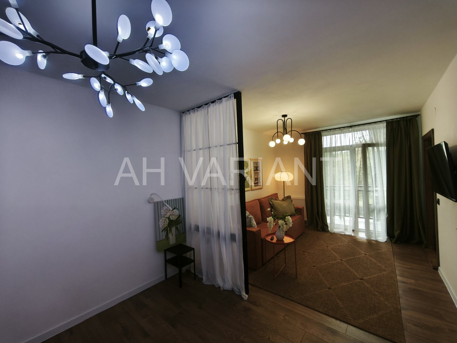 Всередині квартири власники зробили стильний євроремонт в англійському стилі, всі меблі, м’яка частина та техніка була придбана під замовлення. Міжкімнатні двері , стіл з стільцями зроблені з натурального дерева. Додатково ще встановлять двоспальне ліжко .