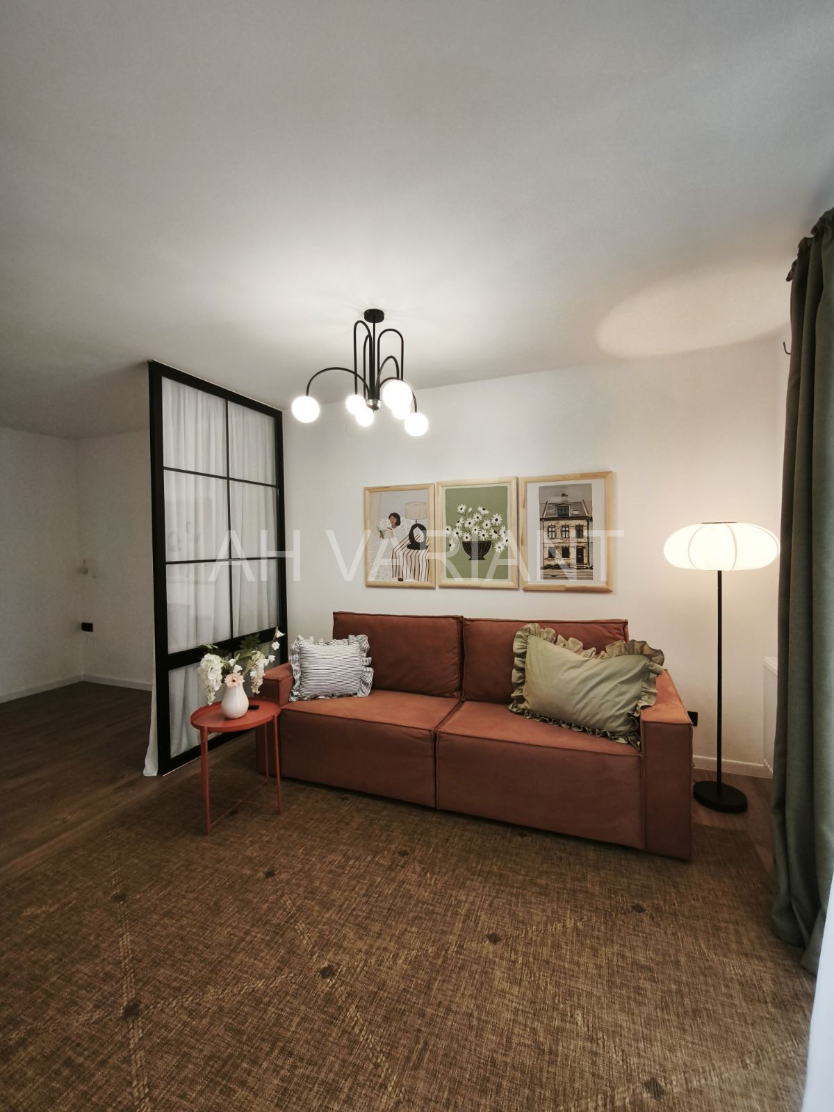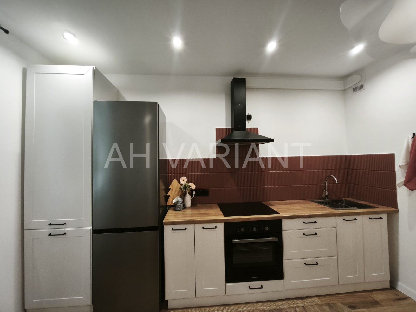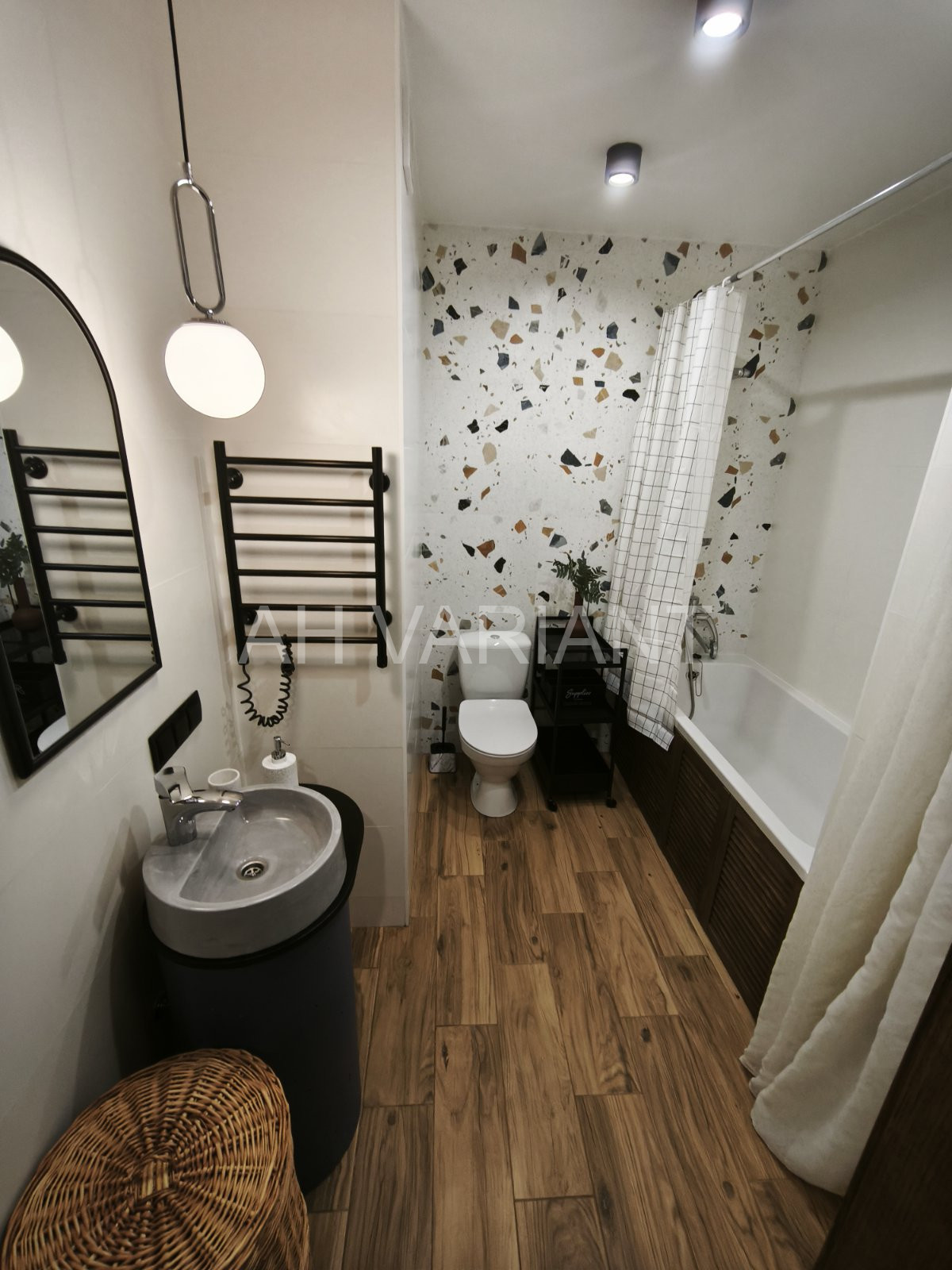 Всередині квартири власники зробили стильний євроремонт в англійському стилі, всі меблі, м’яка частина та техніка була придбана під замовлення. Міжкімнатні двері , стіл з стільцями зроблені з натурального дерева. Додатково ще встановлять двоспальне ліжко .